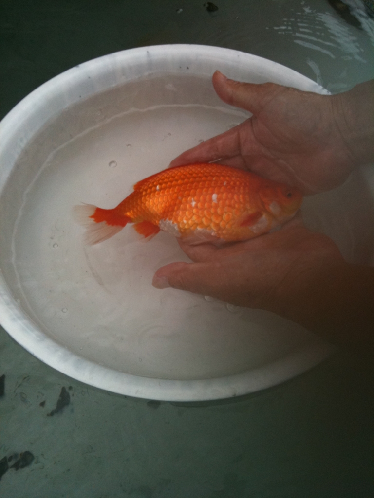 わたくしどもの長崎のお客さまである某会社経営者さまの趣味は金魚です。自宅をおみせできないのですが残念ですが、母屋の廻りはそれぞれが畳2畳~4畳ほどの大きさのコンクリートでこしらえた水槽で囲まれています。自宅内には、一般によく見かける透明の水槽が所せましと並んでおります。そっち系のマニアではそこそこ名前を知られているようです。